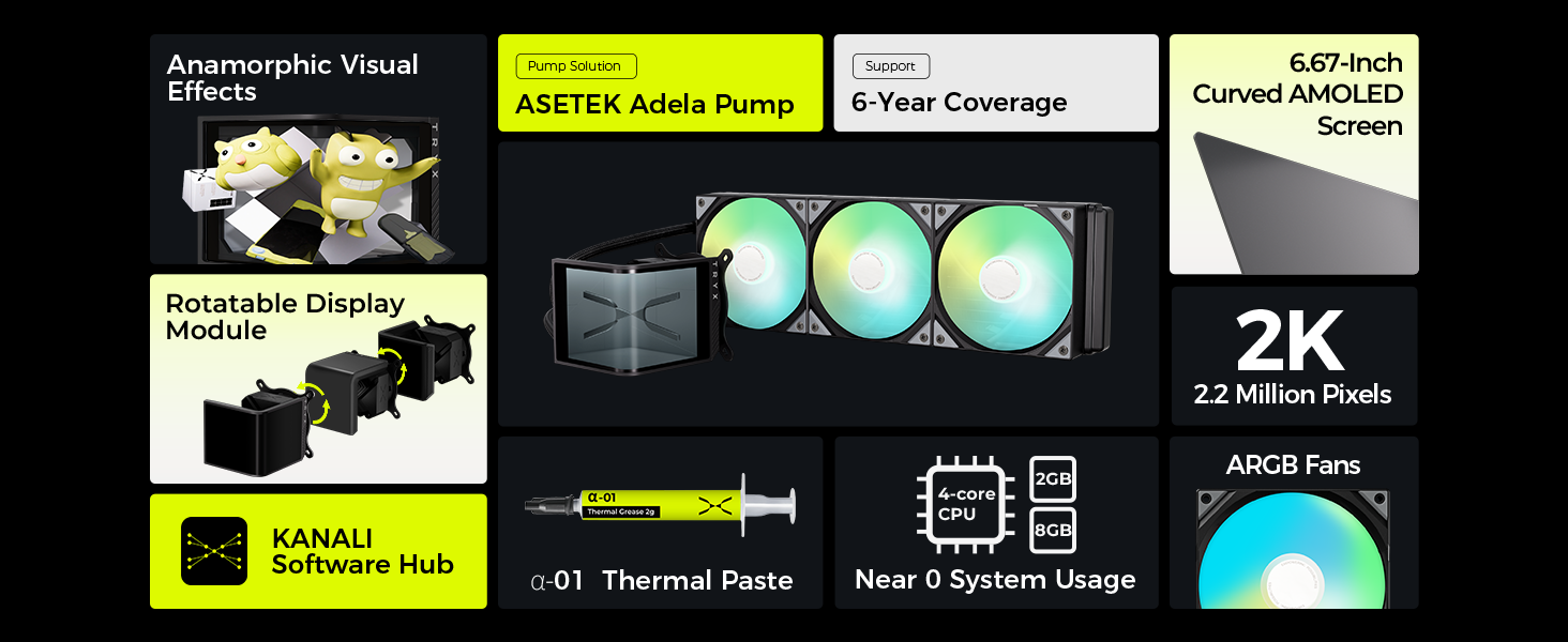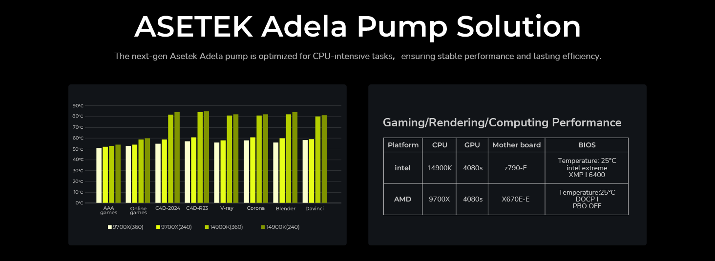 | Cooling Solution | ASETEK ADELA | Asetek 7th Gen V2 | ASETEK ADELA | ASETEK ADELA | ASETEK GEN 8 V2 | Dual-Tower Heatsink |